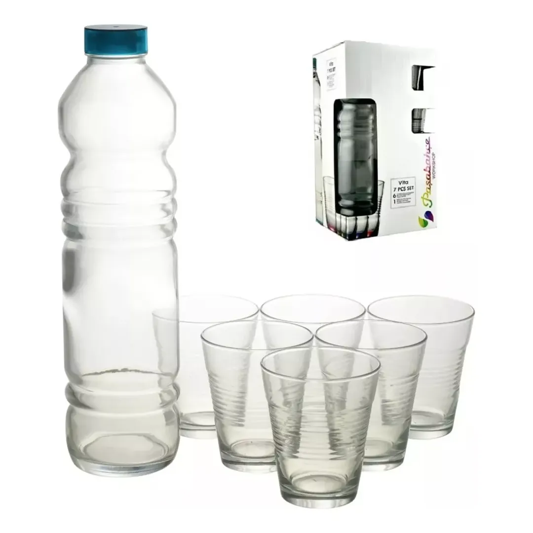 Ideal para servir agua, jugos y gaseosas, este pack incluye una botella y seis vasos, todos de vidrio de alta calidad.