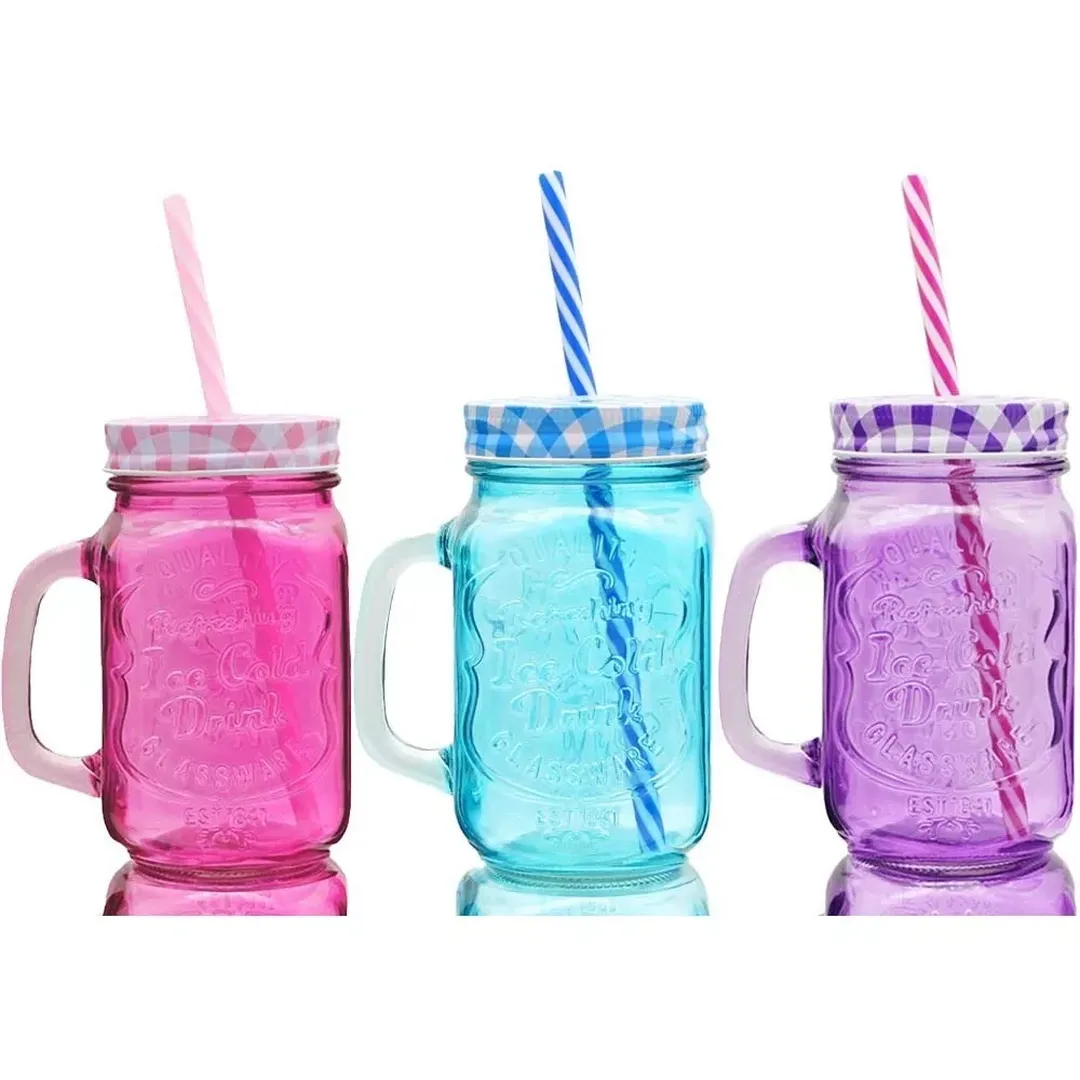 Disfruta de tus bebidas favoritas con estilo y diversión con el Vaso Mason Jar de Vidrio de Colores con Asa, Tapa y Popote Reutilizable de 470 mL.
