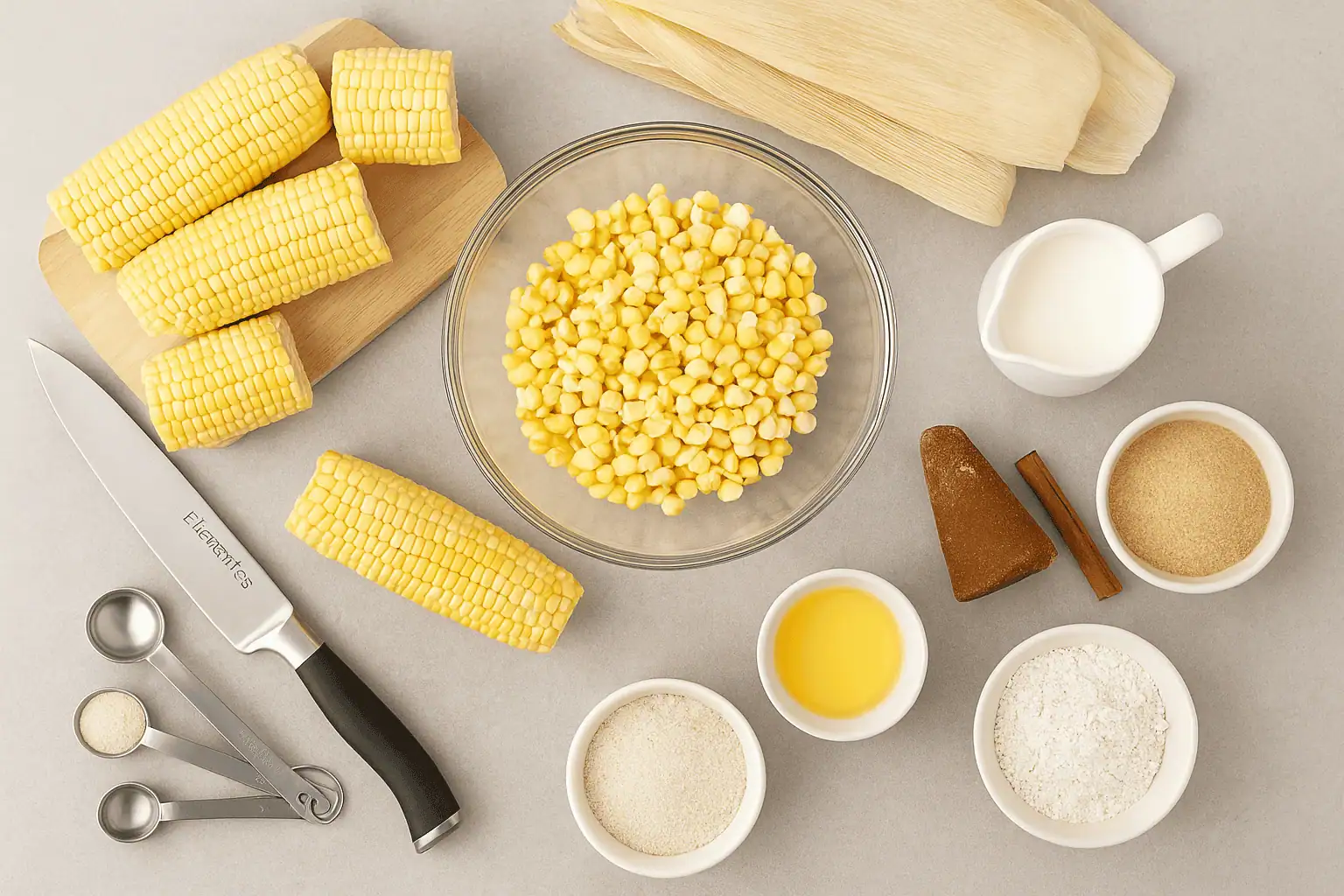Ingredientes y utensilios Elementos Kitchen para preparar tamales de elote dulce sobre superficie clara